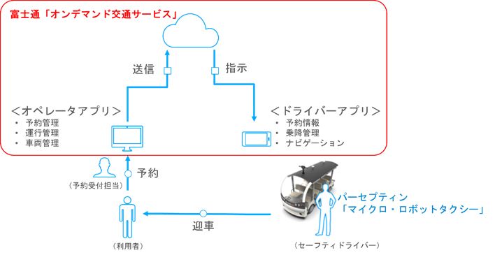 両社は「マイクロ・ロボットタクシー」と富士通のクラウド「オンデマンド交通サービス」を連携することで、地域における交通サービスやビジネスモデルを模索してきた。今回、実証実験で利用者の予約、配車、定員管理、車両位置情報監視を実現する富士通の「オンデマンド交通サービス」を活用して自動運転で周遊する車両を複数停留所での乗降ニーズに応じ効率的に配車できるかを検証する。