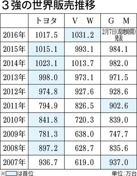 トヨタ自動車は30日、2016年のグループ世界販売(ダイハツ工業、日野自動車を含む)が前年比0・2%増の1017万5千台だったと発表した。この結果、3・8%増の1031万2千台を販売したフォルクスワーゲン(VW)が初の首位に立つことが確実...