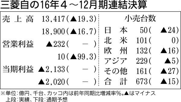 三菱自動車は31日、2017年3月期の営業損益見通しを従来の276億円の赤字から10億円の黒字に上方修正した。為替変動影響と日産自動車との提携以降、取り組んだ経営効率の向上策により、事業採算が大幅に改善する。最終赤字は2020億円と従来見...