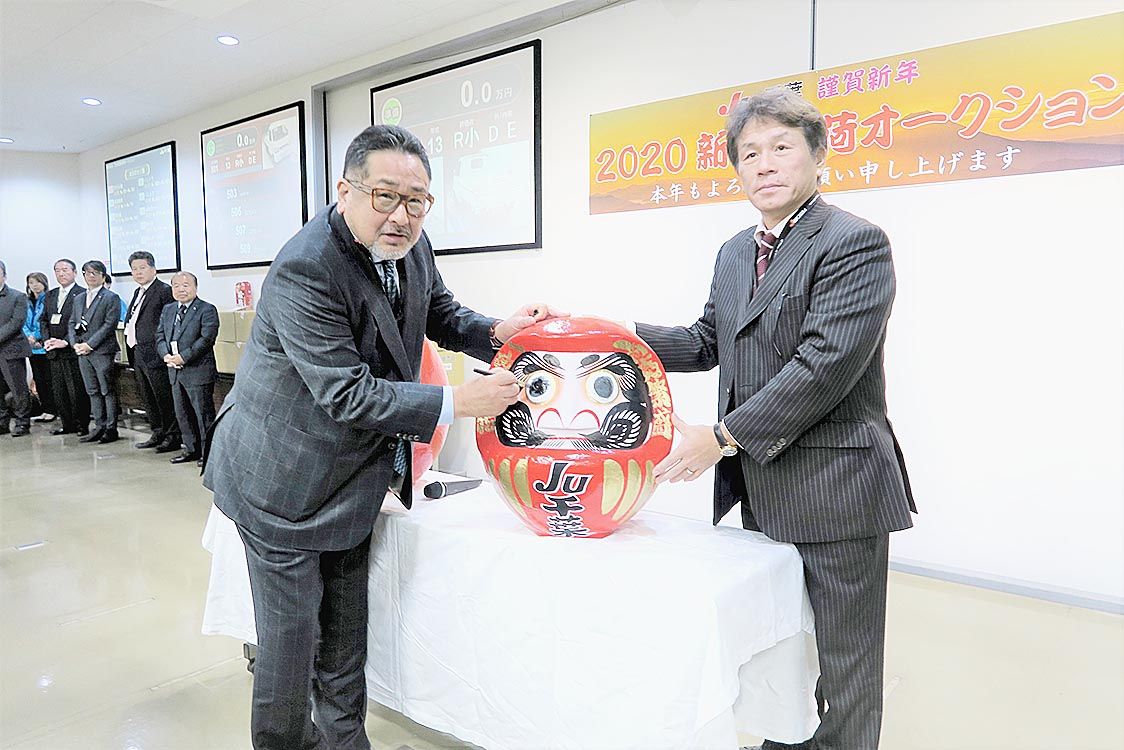 計画達成で両目開眼―。千葉県中古自動車販売商工組合(JU千葉、千﨑悟之理事長)が開いた初荷オートオークションで、2019年の出品台数が7万台を超えたことを祝うダルマの目入れが行われた。 JU千葉のオークション事業は好調が続いている。出品台...