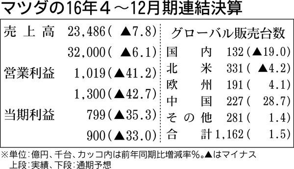 マツダは2日、2017年3月期の営業利益見通しが、従来の1500億円から200億円減少すると発表した。当期純利益の見通しは100億円減の900億円を見込む。為替は円安基調が予想されるが、北米や日本での新車販売伸び悩みや、リコール(改修・無...
