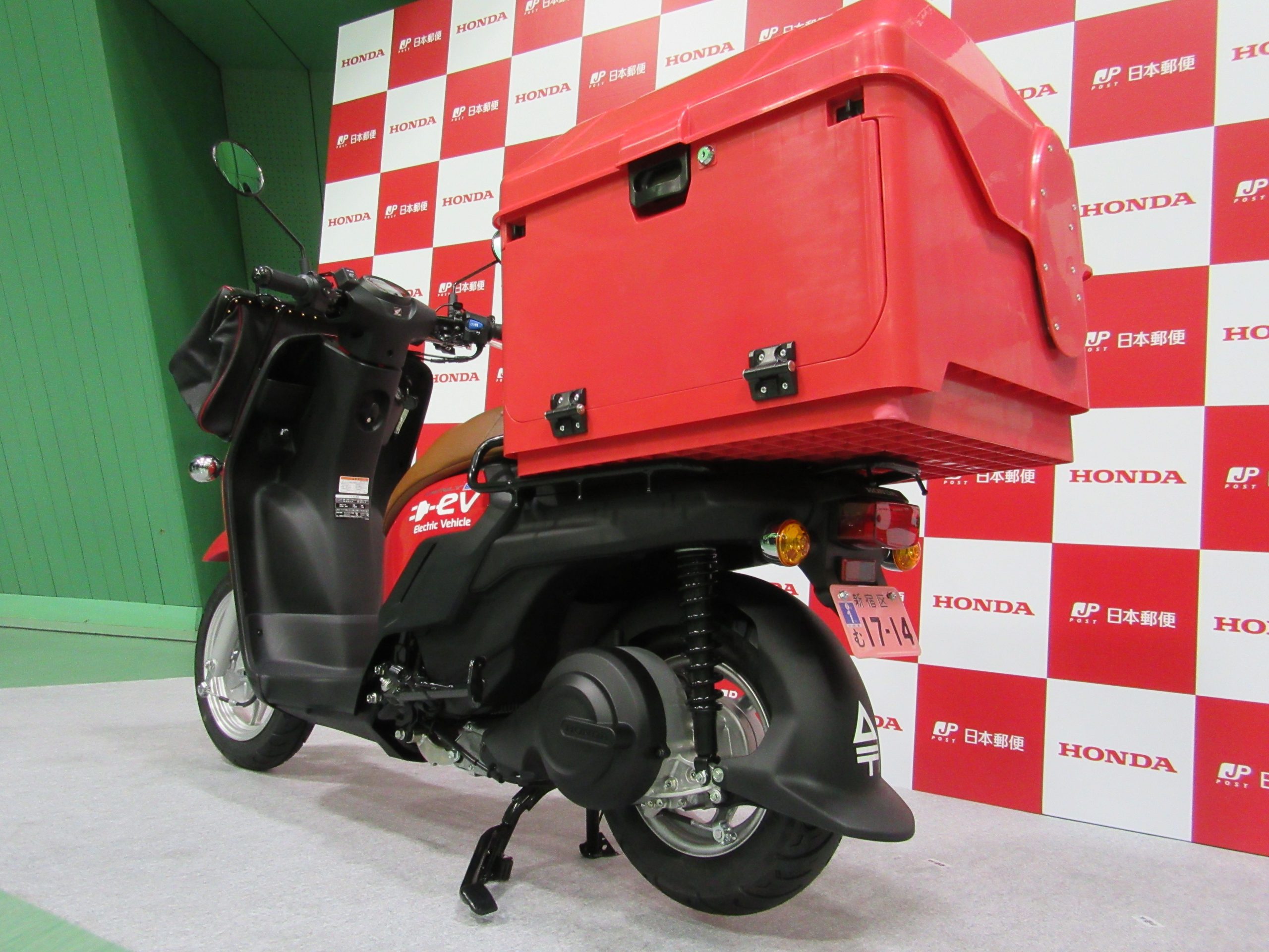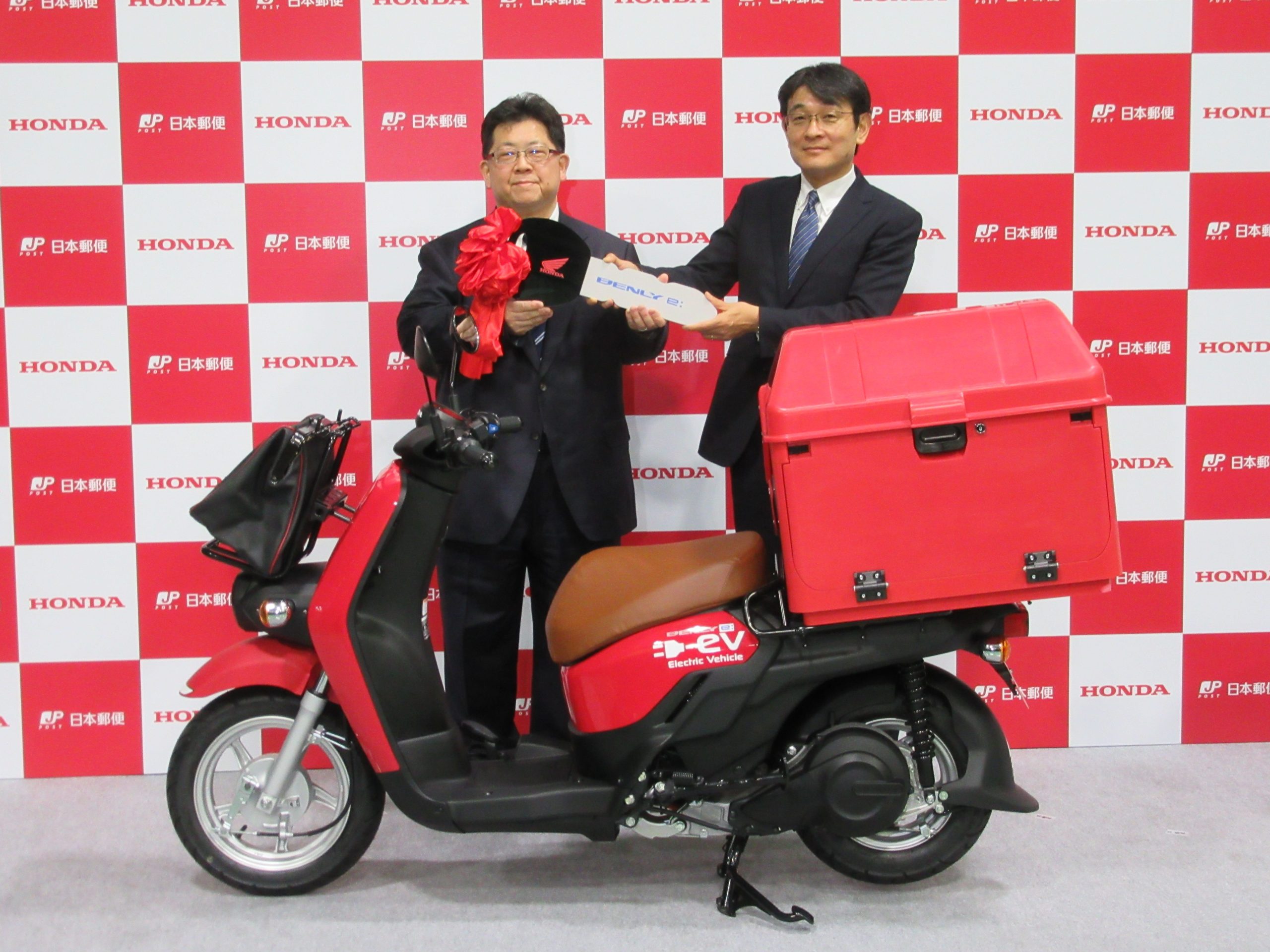 ホンダと日本郵便は、郵便配達用電動二輪車の第1号を引き渡すのを記念して、新宿郵便局で納車式を行った。ホンダは昨年12月19日、ビジネス用電動二輪スクーター「ベンリィ e:」を法人向けに2020年4月に販売すると発表していた。郵便局に納車する電動二輪車は、ベンリィ e:をベースに、郵便配達用に荷物収納箱などを装着した。バッテリーは着脱式で、チューブレスタイヤを採用している。