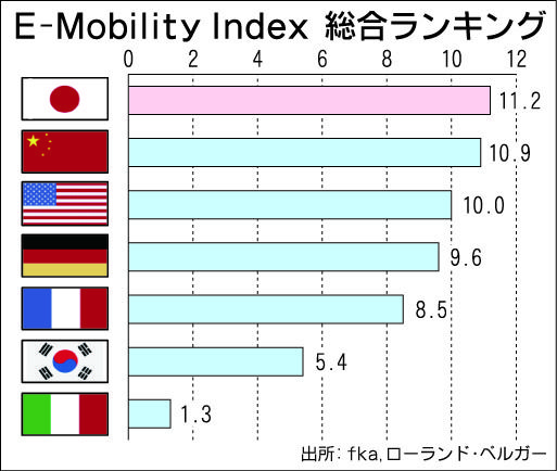 ローランド・ベルガーは電気自動車(EV)を生産する主要7カ国の競争力を比較した結果を「E―モビリティ・インデックス」としてまとめ、ドイツの自動車研究機関のfkaと共同で発表した。「産業」「技術」「市場」の三つの指標で評価した結果、総合評価...