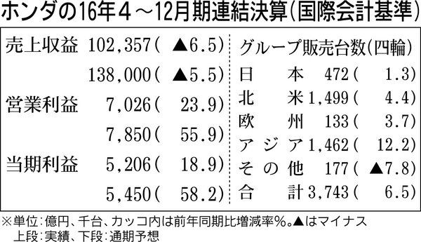 ホンダは3日、2017年3月期通期の売上収益(売上高に相当)、利益見通しを上方修正して発表した。二輪、四輪の売り上げ台数見通しは引き下げたものの、為替換算影響やコストダウン効果などにより従来予想を上回る。同日発表した16年4~12月決算は...