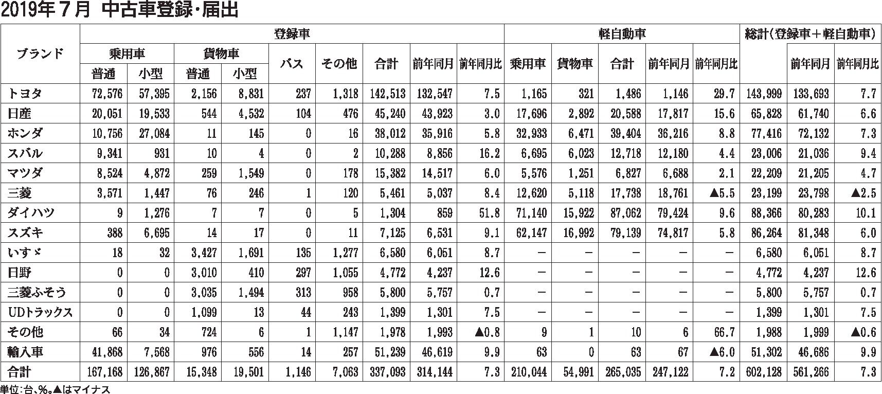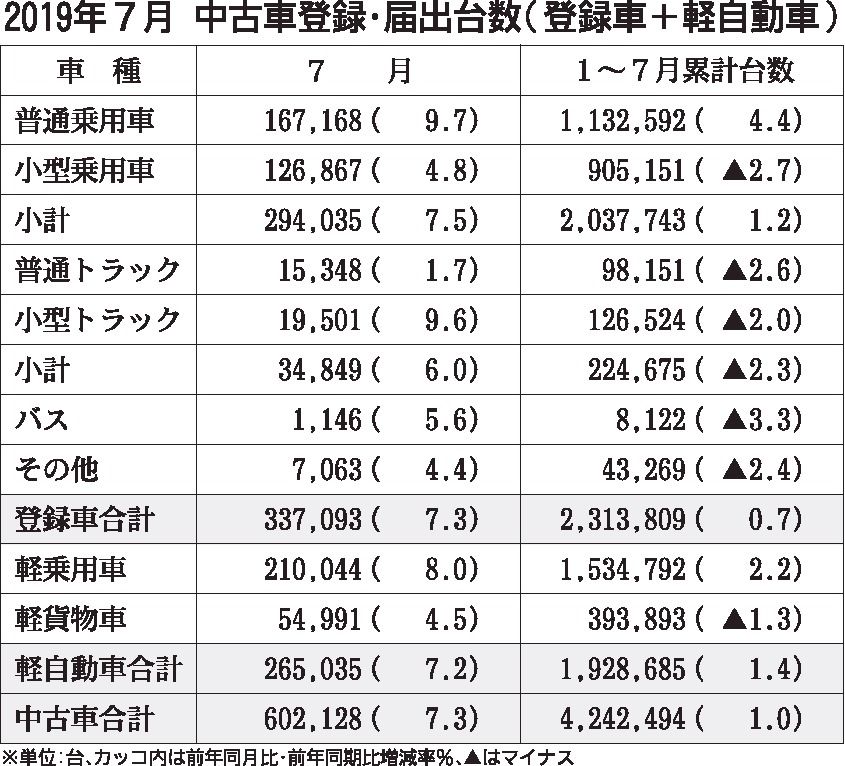 2019年7月の中古車登録・届け出台数、3カ月振りプラス