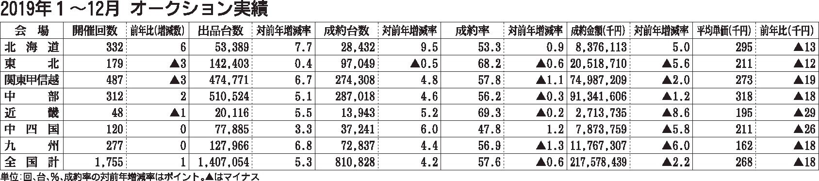 日本中古自動車販売商工組合連合会(JU中商連、海津博理事長)がまとめた2019年1~12月のJU系中古車オークション(AA)実績は、出品台数が前年比5・3%増の140万7054台だった。140万台を超えるのは08年以来、11年ぶり。10~...
