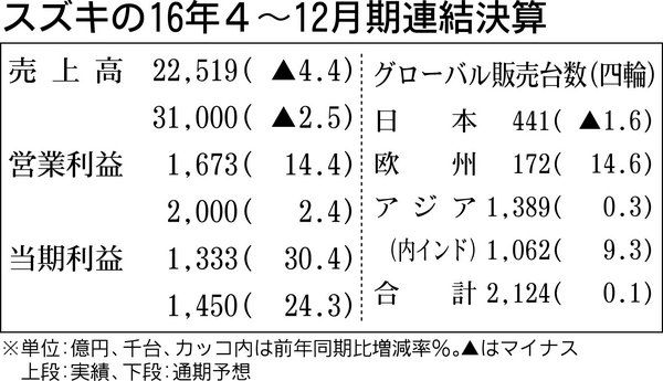 スズキは6日、2016年4~12月期決算を発表した。売上高は5期ぶりに減少したものの、営業利益、四半期純利益ともに過去最高を更新。インド、欧州での四輪車販売の増加により世界販売は前年同期比0・1%増の212万4千台と過去最高を記録した。通...