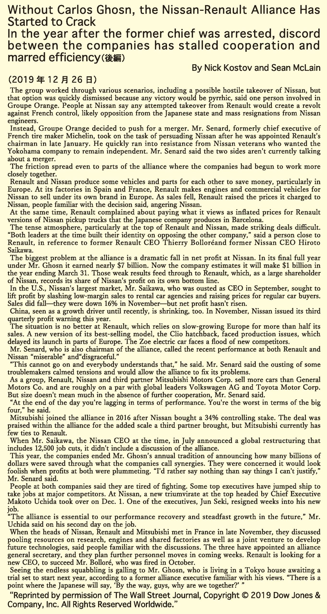 By  Nick Kostov and Sean McLain2019 年 12 月 26 日  グループはさまざまなシナリオについて検討した。中には、日産に敵対的買収を仕掛けるというものもあった。しかし、同グループに関わった人物によれば、...