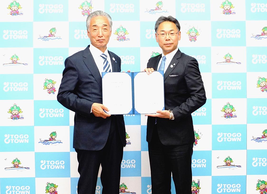 ○…協定書を抱えて写真に納まったのは愛知県東郷町の井俣憲治町長(写真右)とホワイトハウスの木村文夫社長(同左)。両者は愛知県の尾張東部地区で初となる「災害時車中泊場所等オープンスペースに関する協定」を8日に締結し、同日、同協定を発効した。...