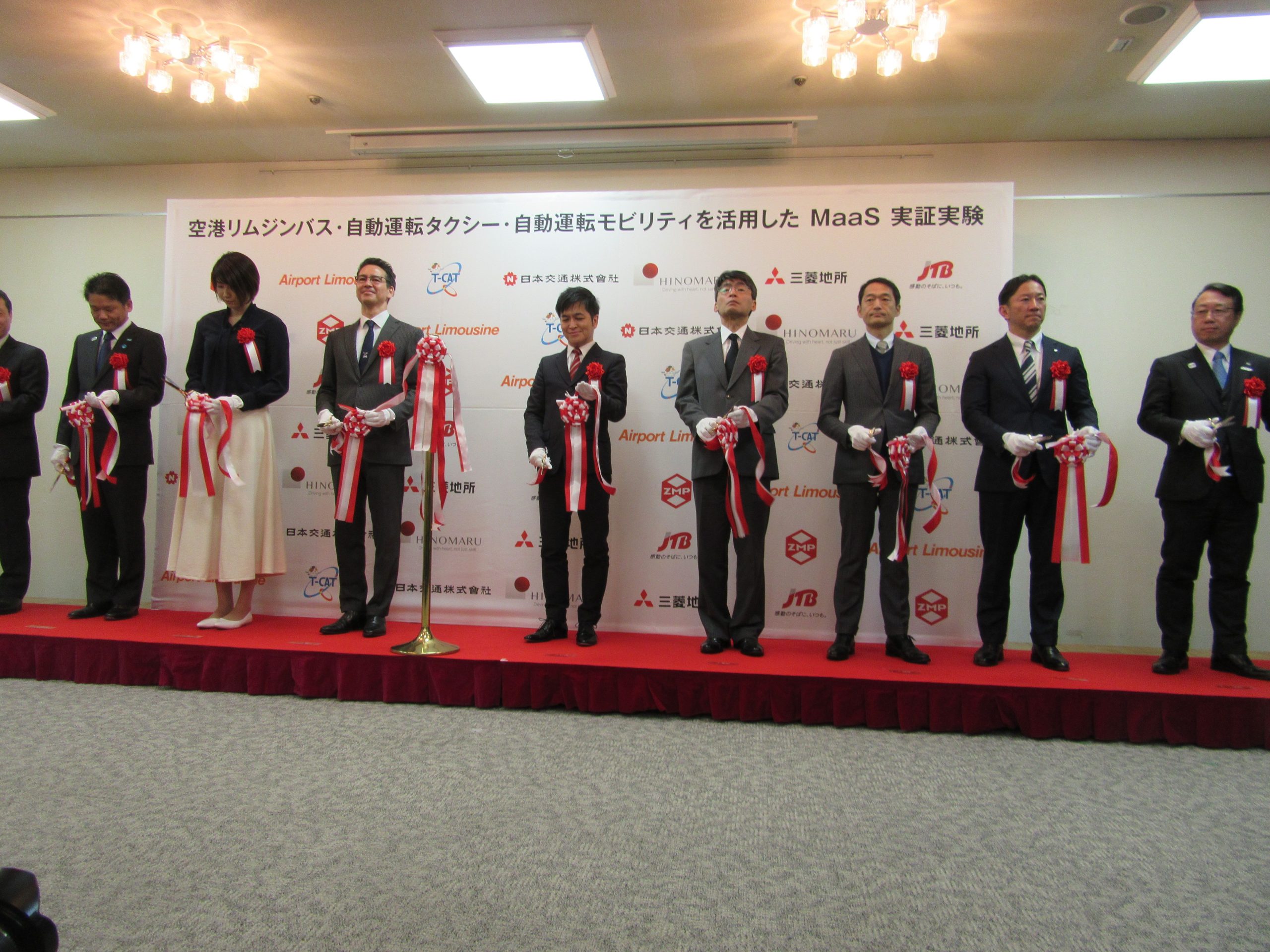 同日、首都高速道路、地下鉄の駅と直結している東京シティ・エアターミナル(T-CAT)で、空港リムジンバス・自動運転タクシー・自動運転モビリティを活用したMaaS実証実験セレモニーが開催され、実験参加企業のほか、東京都の宮坂学副知事、国土交通省の一見勝之自動車交通局長らとともにテープカットを行った。