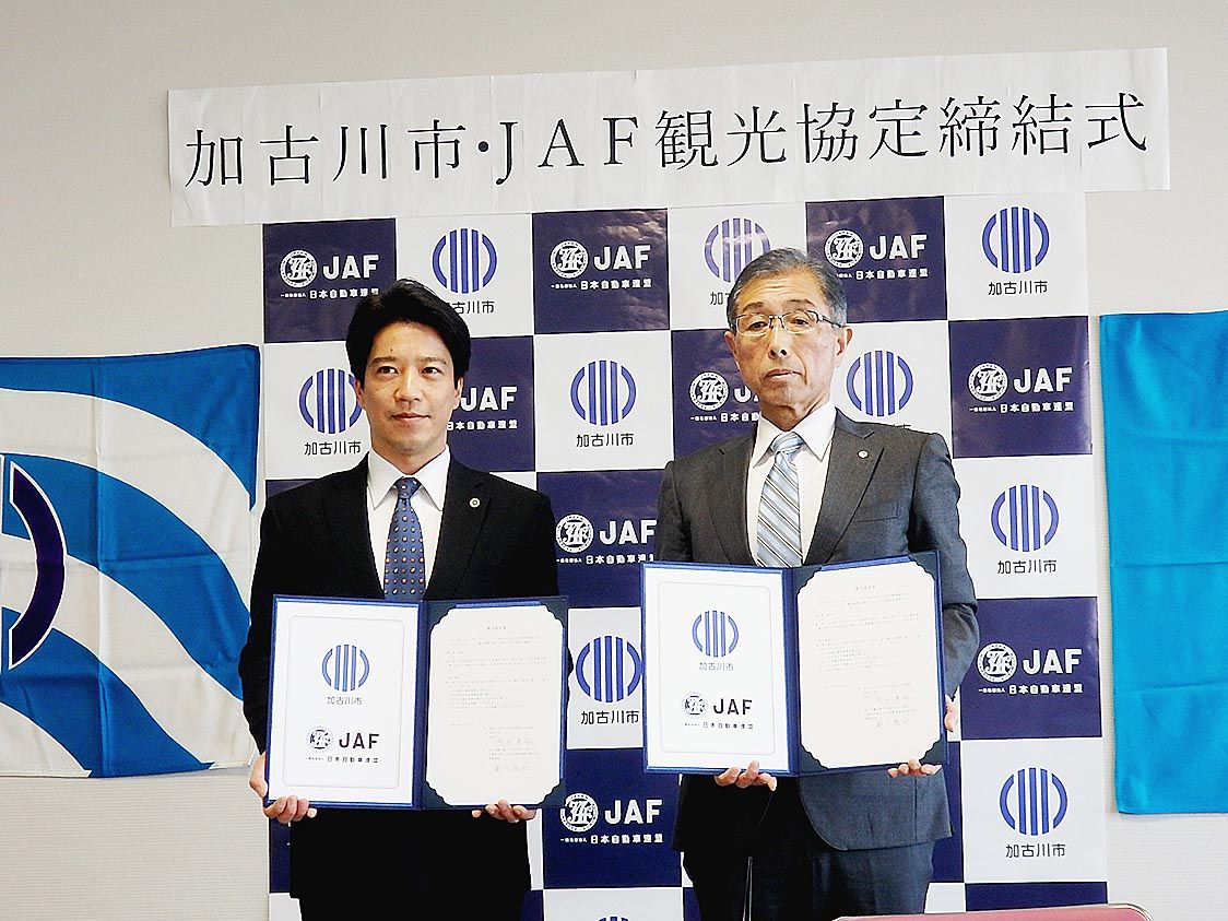 【神戸】日本自動車連盟(JAF)兵庫支部(西川博之支部長)は15日、加古川市(岡田康裕市長)と観光振興に関する包括連携協定を結んだ。JAFは会員向けの情報誌やウェブサイトなどで、加古川市の観光情報や地域情報を発信するなどして加古川市の地域...