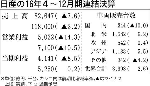 日産自動車が9日発表した2016年4~12月期決算は、円高が大きく影響し、売上高、利益ともに減少した。販売台数は増加し、購買コストの削減も進んだが、為替影響を補えなかった。 4~12月期の減収減益は13年3月期に会計方針を変更して以来、初...
