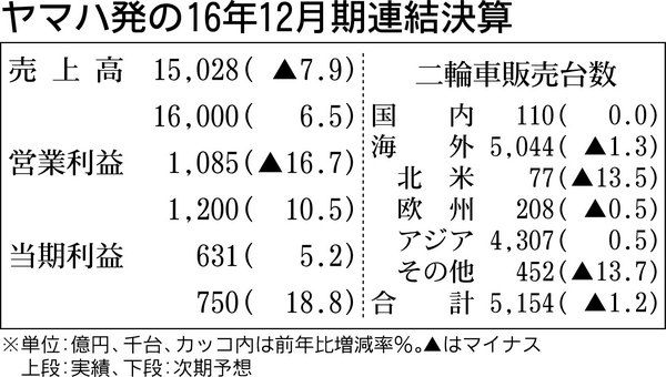 ヤマハ発動機が9日発表した2016年1~12月期決算は、二輪車の販売がインドネシアや中国で減少したほか、円高影響を受け、売上高と営業利益は4期ぶりに減収減益となった。一方、当期純利益は2期ぶりの増益に転じた。17年は為替影響が軽微となるこ...