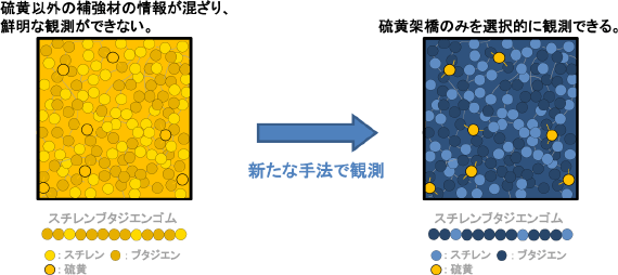 今回、同社は茨城大学との共同研究で、ゴム内部の材料を選択的に観測できる手法を確立した。この手法を使うことで硫黄架橋の粗密を選択的に観測することに成功した。