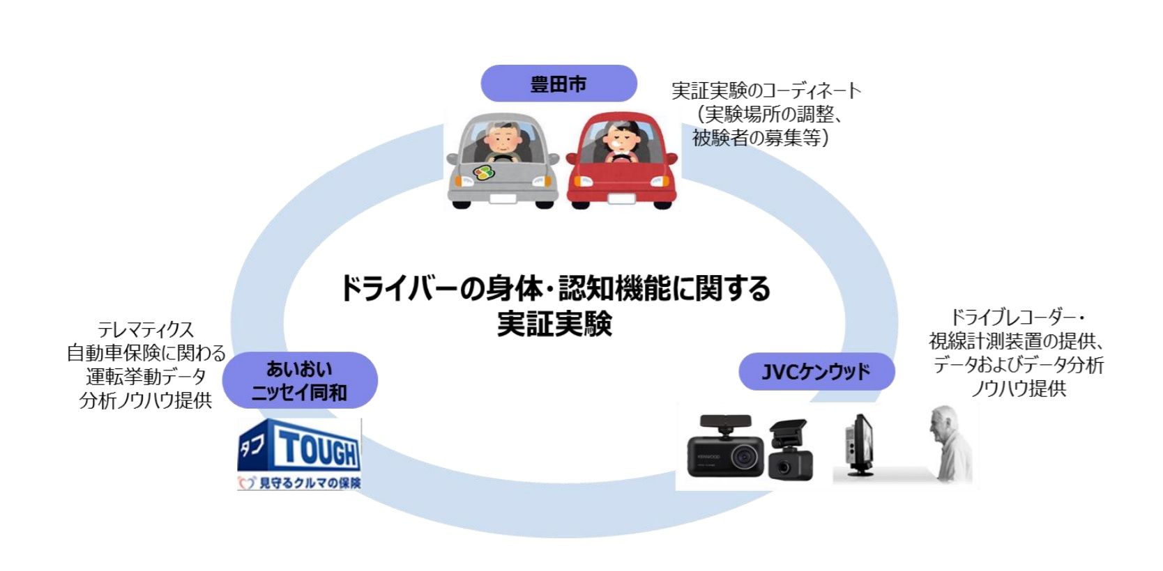実験では豊田市が実験場所の調整、被験者の募集など、実証実験のコーディネートを担当する。あいおいニッセイ同和損保はテレマティクス自動車保険に関する知見・データ分析などのノウハウを、JVCケンウッドがドライブレコーダー・視線計測装置の提供や、データ分析のノウハウをそれぞれ提供する。