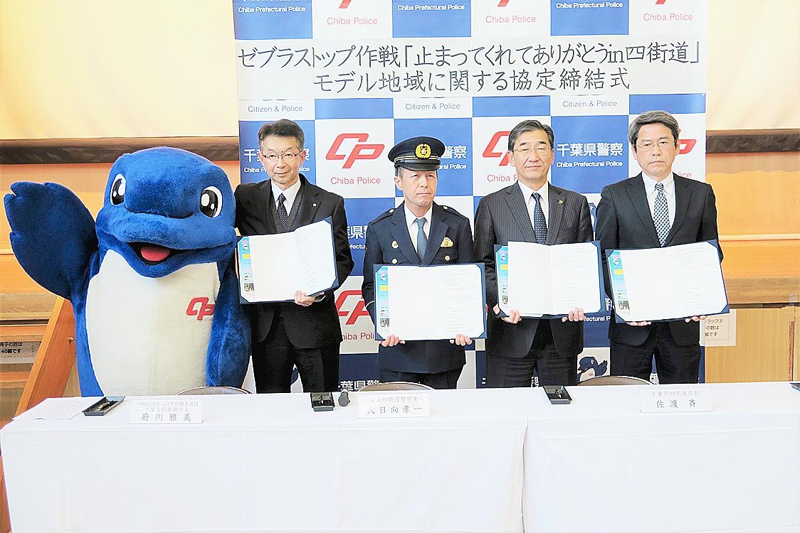 日本自動車連盟(JAF)千葉支部(上出賢治支部長)は、千葉県四街道警察署などと連携し、信号機がない横断歩道での一時停止率を高めるための協定を結んだ=写真。 協定は、四街道警察署がモデル地域で推進する交通安全啓発活動「止まってくれてありがと...