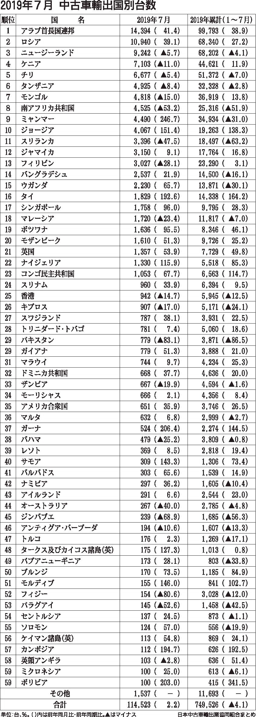 日本中古車輸出業協同組合(佐藤博理事長)がまとめた2019年7月の国別中古車輸出台数は、前年同月比2・2%増の11万4523台となり、5カ月ぶりのプラスに転じた。右ハンドル規制の影響で18年7月実績が大きく落ち込んでいたミャンマーが前年同...