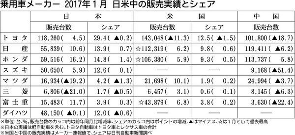 乗用車メーカーの1月の日米中販売台数は、春節の影響により中国の販売がホンダを除く6社で減少した。一方、米国は市場が前年を下回ったものの、日産自動車、ホンダ、富士重工業の3社が1月として過去最高を記録した。 中国の1月の市場は251万950...