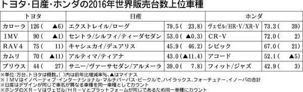 日刊自動車新聞がまとめたトヨタ自動車、日産自動車、ホンダの大手3社の2016年車種別販売台数は、中国、米国の2大市場でSUVの人気が上昇したことにより、3社ともSUVの販売が好調だった。各社の上位5車種の販売全体に占める割合はホンダが最も...