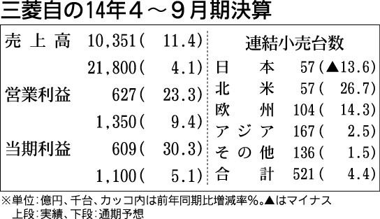 三菱自動車は29日、2015年3月期の売上高予想を前回公表(4月24日)値に比べて1200億円減の2兆1800億円に下方修正すると発表した。世界で市場での競争が激化しており、市場環境や経済状況を勘案して小売販売計画台数を9万3千台減の10...