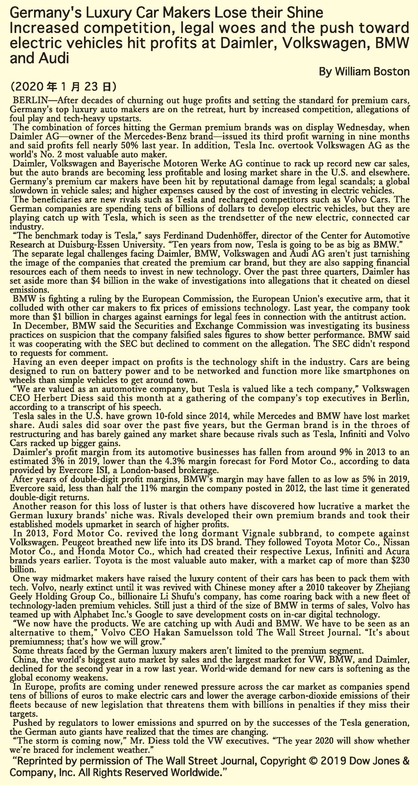 By William Boston2020 年 1 月 23 日  【ベルリン】独大手高級自動車メーカーは数十年にわたり巨額の利益を稼ぎ出し、高級車の基準を設定してきた。しかし、競争激化や不正疑惑、IT(情報技術)に強い新興勢力の台頭で勢い...