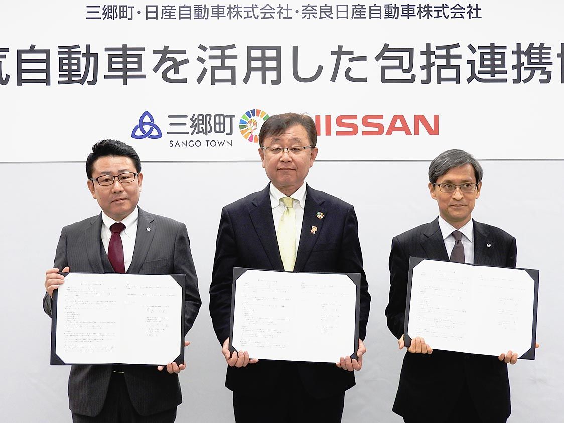 日産自動車と奈良日産(大賀正信社長)、三郷町(森宏範町長)は24日、同町役場で包括連携協定の締結式を開いた。関係者らが見守る中、日産の宮崎真澄西日本リージョナルセールスオフィス部長と大賀社長、森町長が協定書にそれぞれ調印した。 宮崎部長は...