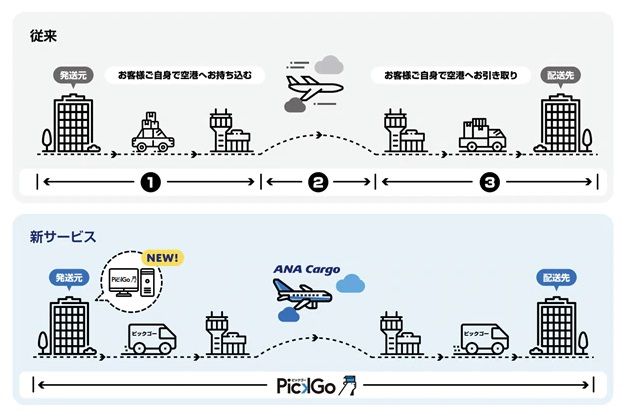 今回、両社が提供する物流MaaSサービスは、発送元から輸送先まで、オンラインで即時に輸送手段を一括で手配できる。CBcloudがPickGoとANA Cargoシステムを連携し、積地から空港、空港から目的地までの軽貨物ドライバーの手配と運行管理を担当する。