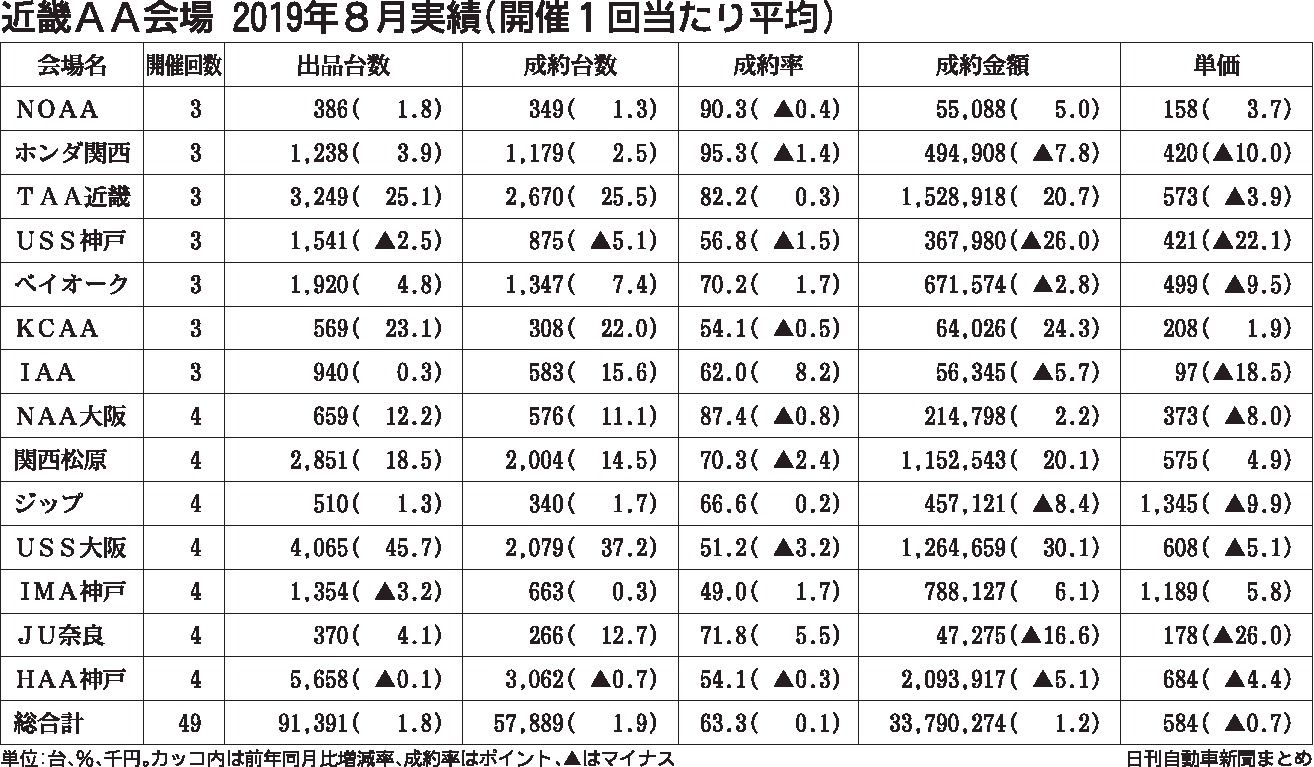 近畿地区にある中古車オークション(AA)14会場の8月実績がまとまった。開催回数は全49回で、前年同月(LAA関西は除く)に比べ3回少ない。出品台数は前年同月比1・8%増の9万1391台、成約台数は1・9%増の5万7889台とプラスを確保...