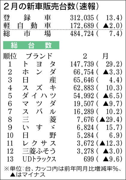 2月の新車販売(登録車、軽自動車合計)は前年同月比7・4%増の48万4724台となり、4カ月連続のプラスだった。登録車が同13・4%増の31万2035台となり、7カ月連続のプラスだった。昨年後半に発売となった新型車が実績を底上げした。1月...
