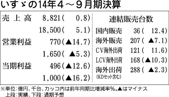 いすゞ自動車が5日発表した2014年4~9月期の連結決算は、純利益は前年同期比12・6%減の496億円と減益となった。タイ市場が低迷した影響で、ピックアップトラックの販売が落ち込んだことや戦略投資を増やしたことから減益となった。 期中の新...