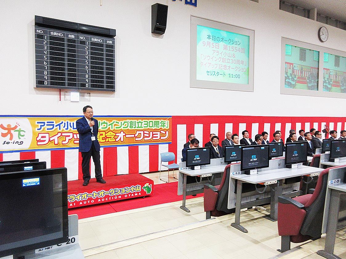 【宇都宮】アライオートオークショングループ(荒井亮三社長)小山4輪会場は、自動車輸送などを手掛けるソウイング(中尾聡社長、栃木県小山市)と共同でアライ小山&「ソウイング創立30周年」タイアップ記念オークション(AA)を開催した=写真。同会...