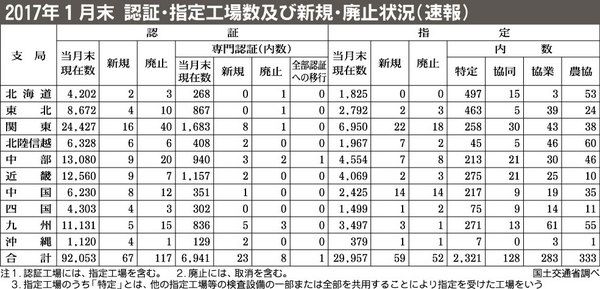 国土交通省は2017年1月末時点の認証・指定工場数および新規・廃止状況をまとめた。認証工場は前月比50件減の9万2053工場となった。指定工場数は7件増の2万9957工場となり、7カ月連続で増加した。専門認証工場数も14件増の6941工場...
