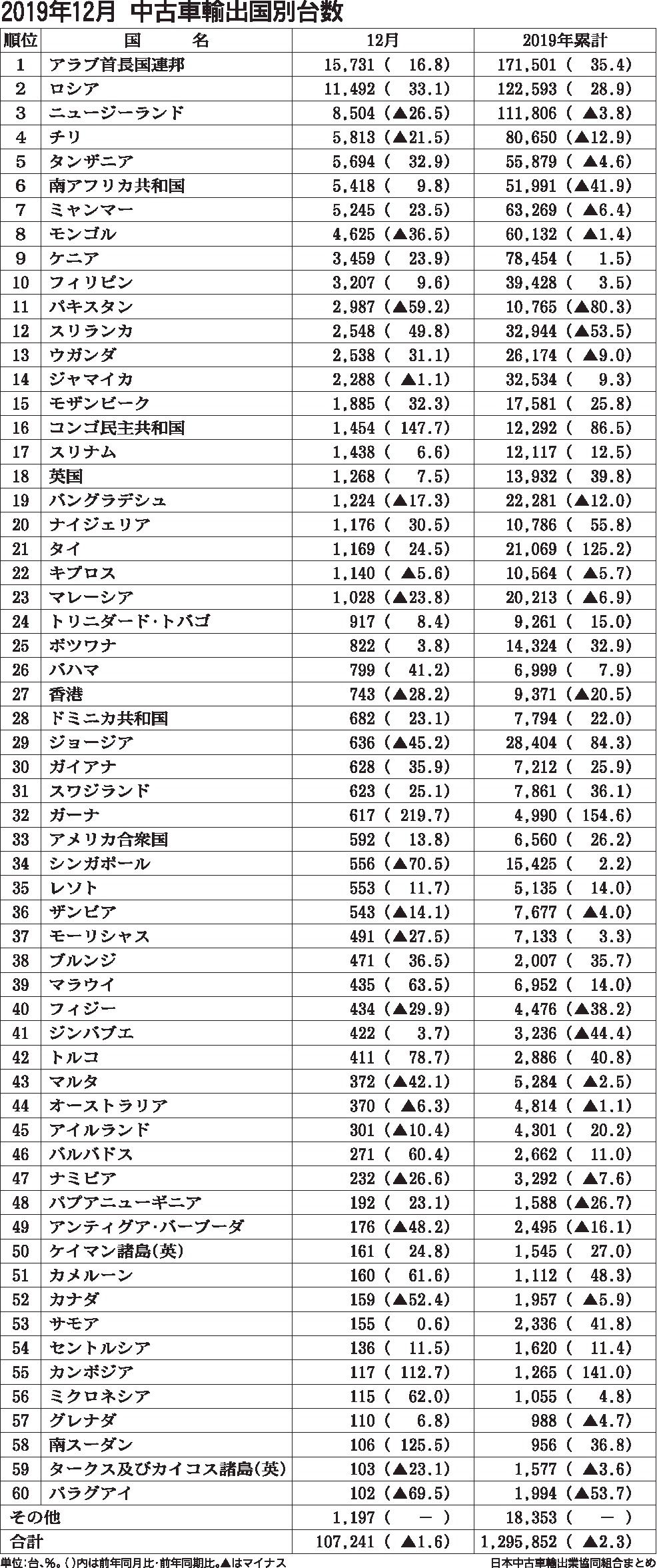 日本中古車輸出業協同組合(佐藤博理事長)がまとめた2019年12月の中古車輸出台数は、前年同月比1・6%減の10万7241台となり2カ月ぶりのマイナスに転じた。輸出前検査の不正が発覚したニュージーランド向けが3割近く落ち込んだ影響が出た。...