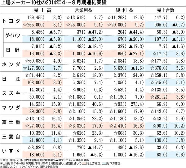 上場している自動車メーカー10社の2014年4~9月期(上期)連結決算が出そろった。消費増税後の国内市場やアジア地域での不振が影響したメーカーが多かった一方、米国市場の好調を始めとする海外市場での販売拡大に円安が追い風となった。その結果8...