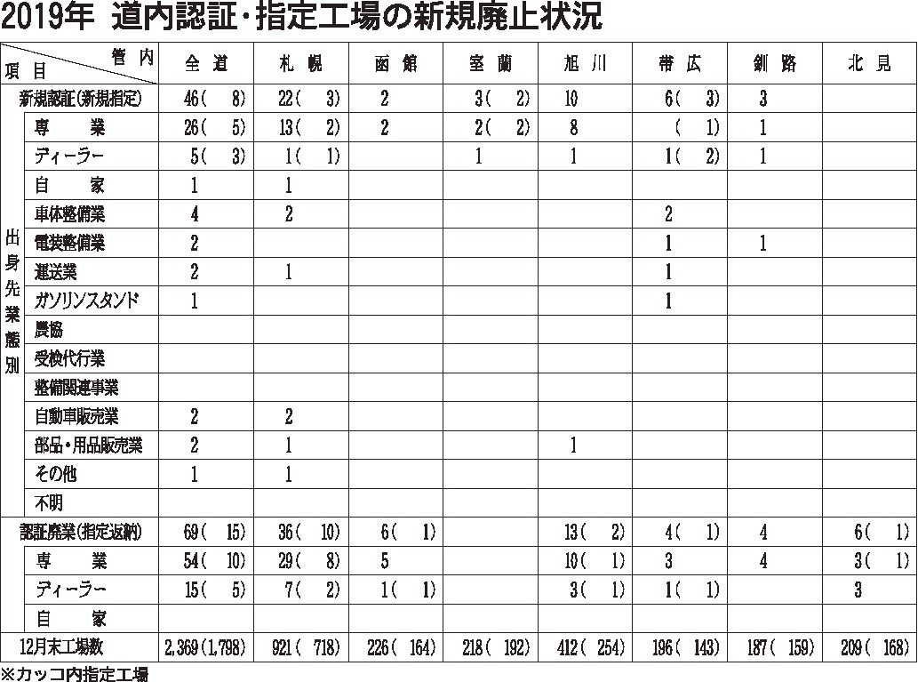2019年の道内自動車分解整備工場の新規・廃止状況がまとまった。新規認証工場は年間46工場にとどまり、認証廃業が69工場に上った。新規の指定工場は8工場で、指定資格返納が15工場あった。この結果、認証工場は23工場も減少し、指定工場も7減...