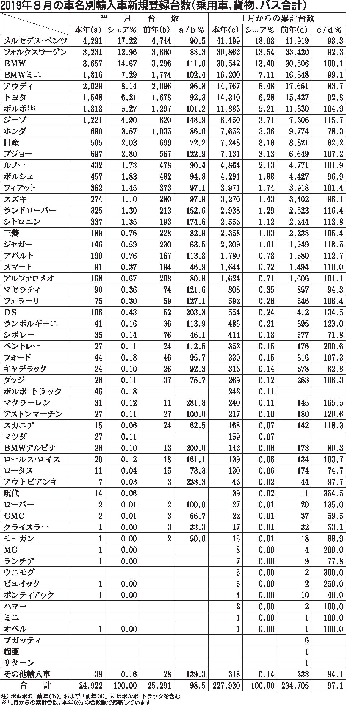 2019年8月の車名別輸入車新規登録台数(乗用車、貨物、バス合計)
