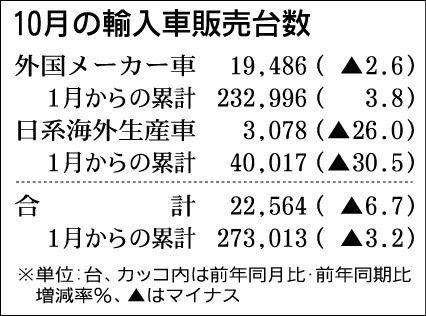 日本自動車輸入組合(JAIA)が7日発表した2014年10月の輸入車新規登録台数は、前年同月比6・7%減の2万2564台で7カ月連続のマイナスとなった。9月はプラスだった外国メーカー車も同2・6%減の1万9486台と前年を下回った。一方で...