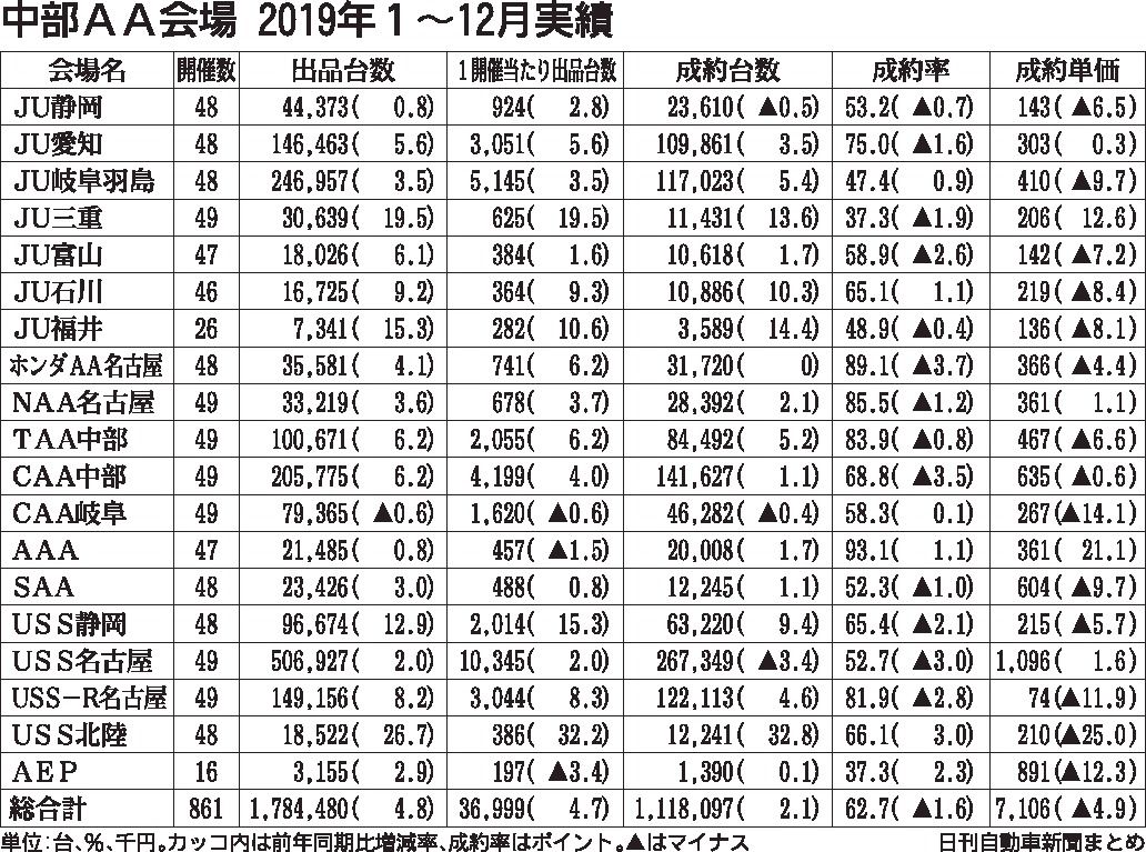 2019年の中部7県(愛知県、岐阜県、三重県、静岡県、石川県、富山県、福井県)の中古車オークション(AA)会場の実績は、日刊自動車新聞社がまとめた結果によると、全19会場のうち18会場で年間出品台数が前年実績を上回った。10月の消費税増税...