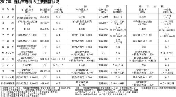 15日にメーカーの回答日を迎えた2017年自動車春闘は、焦点だったベースアップ(ベア)でトヨタ自動車が昨年を200円下回る1300円、日産自動車が半減の1500円を回答し、大手2社が前年割れとなった。一方、ホンダは昨年を500円上回る16...