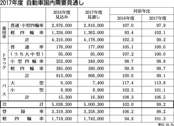 日本自動車工業会(西川廣人会長=日産自動車副会長・共同CEO)は、2017年度の国内需要が16年度見込みを0・8%下回る500万300台になるとの見通しを発表した。16年度は登録車の増加により、前年度比2・0%増の503万8300台と3年...