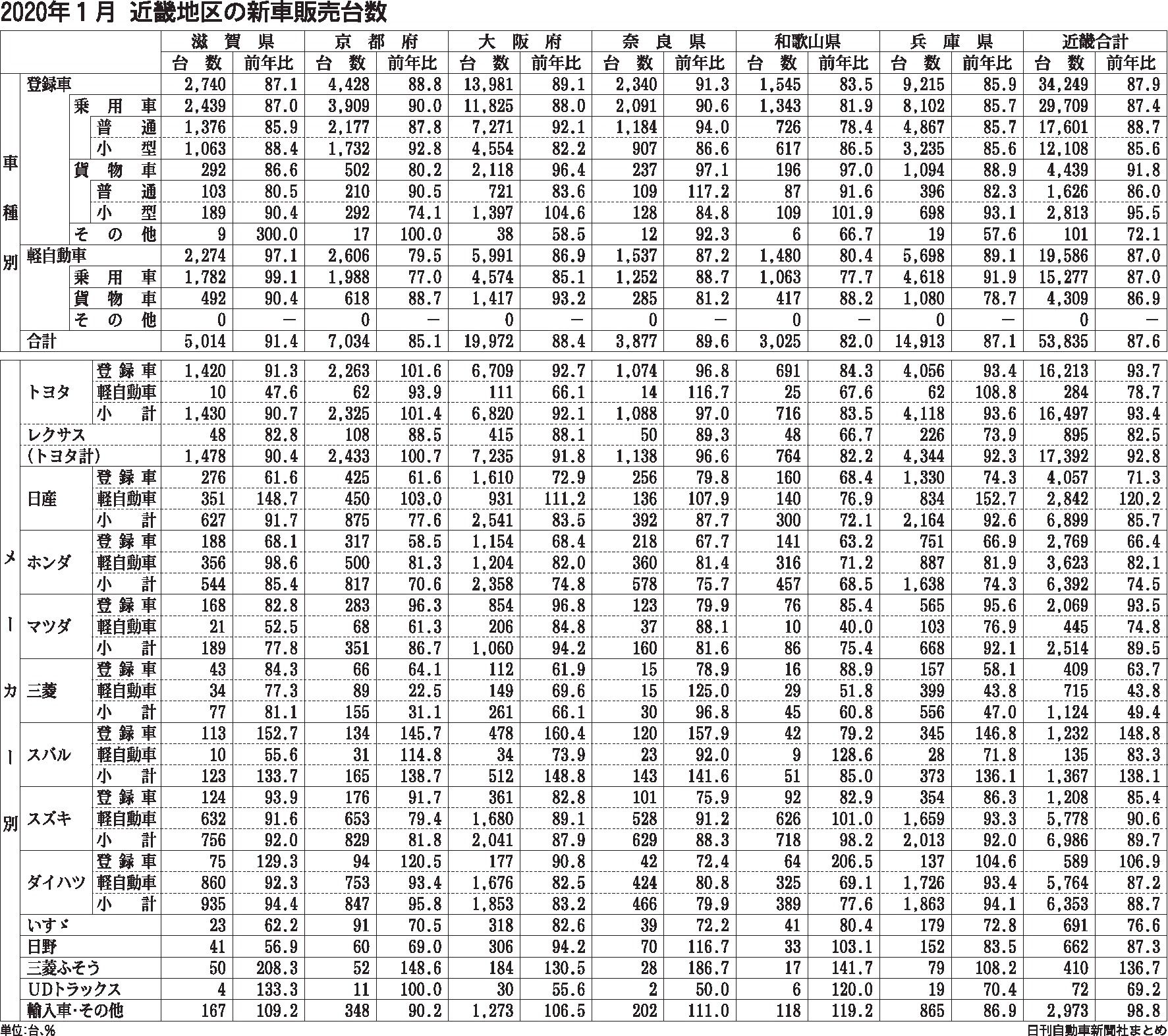 近畿2府4県の2020年1月の新車販売台数は登録車と軽自動車の合計が前年同月比12・4%減の5万3835台となり、4カ月連続で前年を下回った。昨年後半に投入された新型車の販売好調などが追い風となって数字回復への期待が高まっていたが、低空飛...