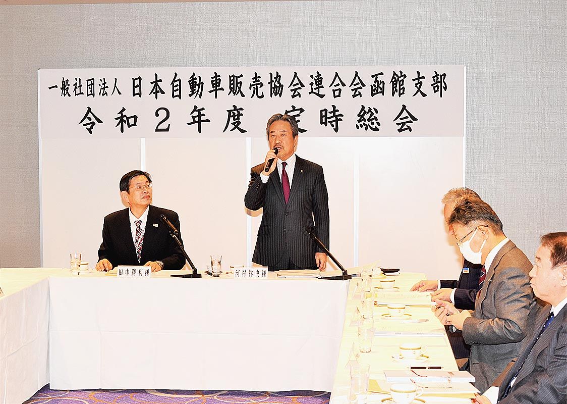 【函館】自販連函館支部は7日、函館市内のホテルで「令和2年度通常総会」を開催。任期満了に伴う役員改選で、河村祥史支部長はじめ全役員の再任を決めた。 河村支部長は「消費税増税による冷え込みが続く中、今年は量販車の安全装備充実や新型車発売、サ...