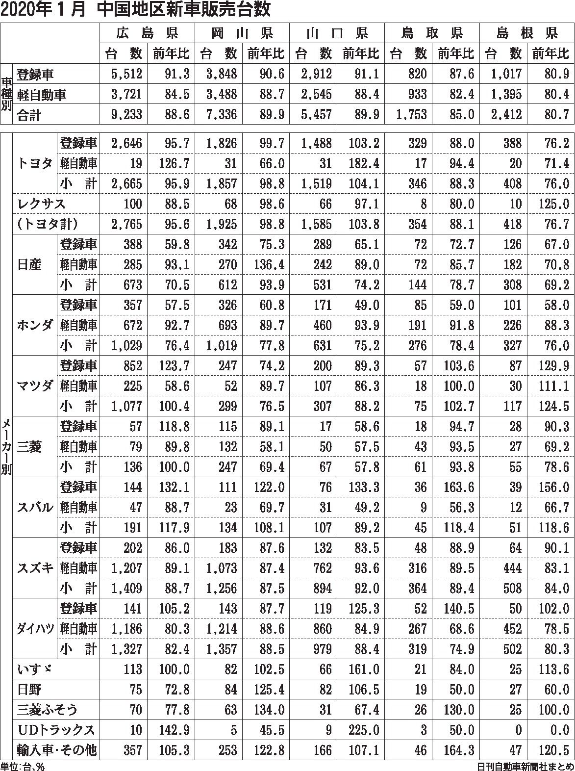 中国地区の2020年1月の新車販売台数(登録車+軽自動車)は前年同期比11・8%減の2万6191台だった。昨年10月の消費増税以降、4カ月連続で前年割れが続いており、新年を迎えても厳しい状況だった。2月はトヨタ「ヤリス」、ホンダ「フィット...