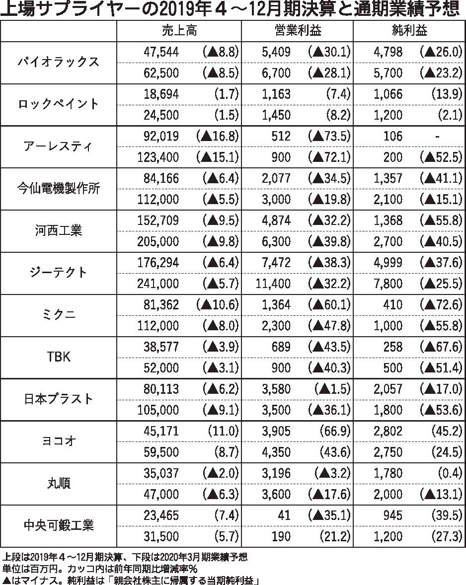 上場サプライヤーの2019年4~12月期決算と通期業績予想