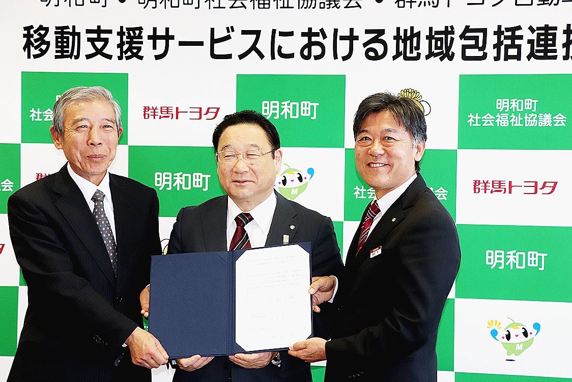 【前橋】群馬トヨタ(横田衛社長)は、「広域移動支援サービスにおける地域包括連携協定」を群馬県邑楽郡明和町ならびに社会福祉法人明和町社会福祉協議会との間で締結した=写真。これは明和町、社会福祉協議会と群馬トヨタが事業主体となり、同町での健康...