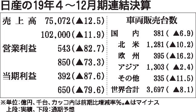 日産自動車が13日に発表した2019年4~12月の連結業績は減収減益となり、営業利益は前年同期比で8割以上減少した。10~12月の四半期実績では、最終損益が261億円の赤字に転じた。四半期の最終赤字は09年4~6月期以来10年半ぶり。内田...