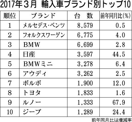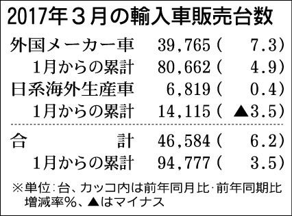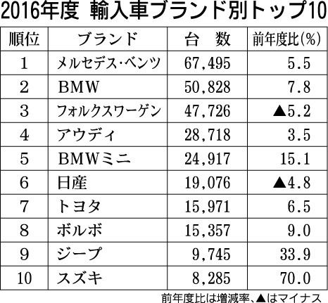 日本自動車輸入組合(JAIA)が6日発表した2016年度の外国メーカー車の新規登録台数は、前年度比5・9%増の29万8856台となり、2年連続でプラスだった。登録車に占めるシェアは8・9%で過去3番目。ブランド別は、14ブランドが過去最高...
