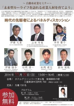 「未来型カーライフを語れる産業人材を育てよう」をテーマとするセミナーが、30日に津市で開催されるは告知ポスター。自動車業界への就職希望者を対象に、自動車関連企業や中小企業の経営者らが産業の魅力や最新の業界動向などを紹介するもので、三重県産...