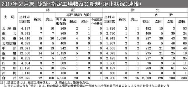 国土交通省は2017年2月末時点の認証・指定工場数および新規・廃止状況をまとめた。認証工場は前月比28件件減の9万2025工場となった。指定工場数は3件増の2万9960工場となり、8カ月連続で増加した。専門認証工場数も12件増の6953工...
