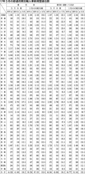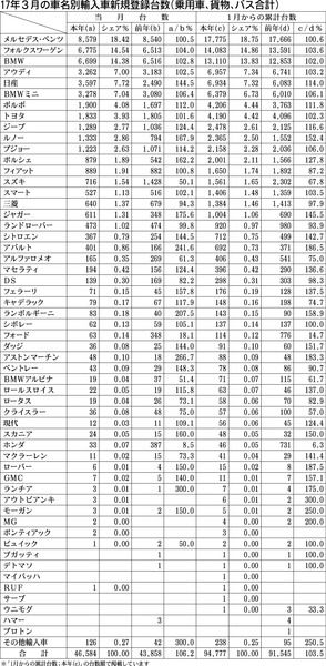 3月の車名別輸入車新規登録台数はメルセデス・ベンツがトップ、次いでフォルクワーゲン、BMWの順となっている。伸び率が大きかったのは日産(前年同月比44・5%増)、ジープ(同24・4%増)、ルノー(同67・9%増)、ポルシェ(同62・2%増)...